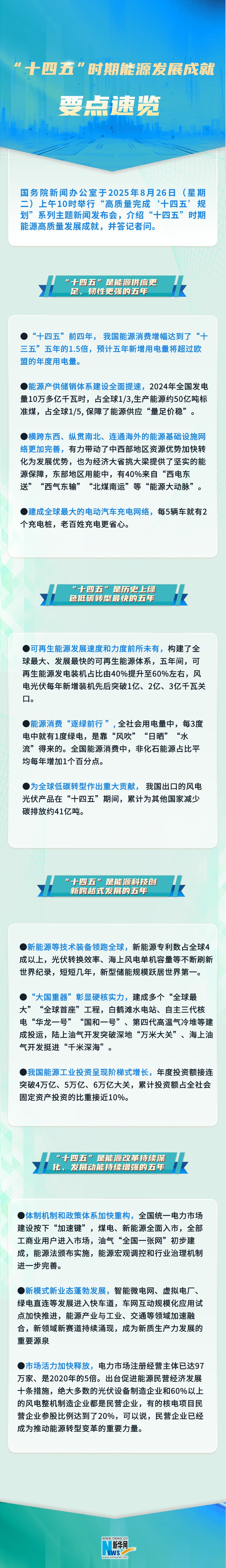 "十四五"时期能源发展成就 GE Hot 国务院新闻办公室于2025年8月26日(星期 二)上午10时举行"高质量完成'十四五'规 划"系列主题新闻发布会,介绍"十四五"时期 能源高质量发展成就,并答记者问。 "十四五"是能源供应更 足、韧性更强的五年 建成会球最大的电动汽车充电网络,每5辆车就有2 个充电桩,老百姓充电更省心。 "十四五"是历史上绿 色低碳转型景快的五年 车生能源发展速度和力度前所未有,构建了全 球最大、友展最快的可再生能源体系,立年间,可 再生能源发电装机占比由40%提升至60%左右,风 电光伏每年新增装机先后突破1亿、2亿、3亿千瓦关 ロ。 ●能源消费"逐绿前行",全社会用电量中,每3度 电中就有1度绿电,是靠"风吹""日晒""水 流"得来的。全国能源消费中,非化石能源占比平 均每年增加1个百分点。 ●"十四五"前四年,我国能源消费增幅达到了"十 三五"五年的1.5倍,预计五年新增用电量将超过欧 盟的年度用电量。 能源产供储销体系建设合面提速,2024年全国发电 量10万多亿千瓦时,占全球1/3,生产能源约50亿吨标 准煤,占全球1/5,保障了能源供应"量足价稳"。 ●横跨东西、纵贯南北 ...