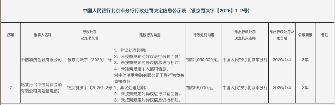 近日,中国人民银行北京市分行发布的一则行政处罚决定信息显示,中信消费金融有限公司(以下简称"中信消金") 因存在未按照规定对异议进行书面 回复、未准确报送个人信用信息等四项违法行为被罚款105万元。同时,中信消金风险管理部赵某丹因对三项违法行为负有直接责任,被罚款9.6万元。 | | | | 中国人民银行北京市分行行政处罚决定信息公示表(银京罚决字【2026】1-2号) | | | | | | | --- | --- | --- | --- | --- | --- | --- | --- | --- | | 序号 | 当事人名称 | 行政处罚 决定书文号 | 违法行为类型 | 行政处罚内容 | 作出行政处罚 决定机关名称 | 作出行政处罚决 定日期 | 公示期限 | 备注 | | | 中信消费金融有限公司 | 1、异议处理超期; 银京罚决字〔2026〕1号 | 2、未按照规定对异议进行书面回复; 3、未按照规定对异议信息进行标注; | 罚款1,050,000元。 | 中国人民银行北京市分行 | 2026/1/4 | 3年 | | | | 赵某丹(中信消费金融 | 4、未准确报送个人信用信息。 直接责任: | ...
