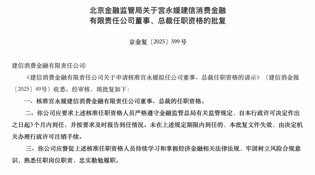 总裁一职空缺8月有余的建信消金,迎来新的继任者。 国庆节前,国家金融监督管理总局北京监管局网站发布了一则批复,该局核准宫永媛建信消金董事、总裁的任职资格。 公开信息显示,宫永媛于2001年7月加入建设银行,先后在总行个人银行业务部、个人金融部、个人存款与投资部任职,2015年11月任个人存款与投资部 资深副总经理;2018年6月任建信基金管理公司纪委书记、党委委员,后先后担任建信基金副总裁,兼任财务负责人、首席信息官。 上任后,宫永媛将成为建信消金第二任总裁。 2025年1月,建信消金原总裁李建峰升任董事长,此后总裁一职空缺至今。深耕个人金融条线超过17年的宫永媛继任,能否拯救建信消金当下的业绩困境 成为关注的焦点。 半年报显示,截至2025年6月末,建信消金资产总额126.71亿元,较去年末增长0.78%;上半年净利润0.03亿元,同比下降95.24%。 迎第二任总裁 北京金融监管局发出的批复显示,宫永媛任职资格于9月26日获批。 当然,亦有不同的声音:宫永媛虽有17年个人金融条线经验但在公募基金行业,与消费金融行业存差异,前者侧重资产管理与净值波动,后者聚焦场景获 客与风险定价,跨领域经验能否直接复用存疑 ...