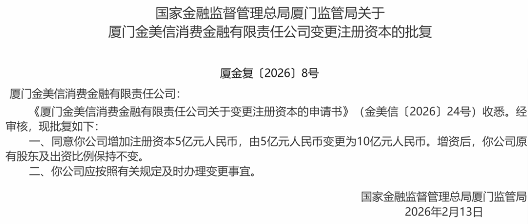 金美信消金获批增资至10亿元!
