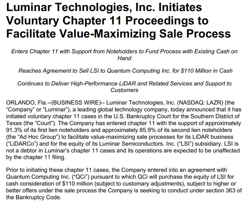 Luminar Technologies股价周一暴跌58%,此前这家激光雷达技术公司申请了第11章破产保护并宣布 计划出售其资产。 公众号记得加星标⭐️,第一时间看推送不会错过。 这家总部位于奥兰多的公司在约91.3%的第一留置权票据持有人和85.9%的第二留置权票据持有人的 支持下进入破产程序。Luminar将"传统债务义务和行业采用步伐"列为挑战其可持续运营能力的因 素。 作为重组的一部分,Luminar已达成协议,将其子公司Luminar Semiconductors Inc. (LSI)以1.1亿 美元现金出售给Quantum Computing Inc.。Quantum Computing的股价在公告后下跌6.8%。 Luminar首席执行官Paul Ricci表示:"在过去六个月中,我们采取了有意义的步骤来推动运营纪律, 精简成本结构,并明确战略方向。经过对我们各种选择的全面审查,董事会确定法院监督下的出售程 序是最佳前进道路。" 该公司计划在破产过程中继续运营,保持向客户交付其激光雷达硬件和软件。Luminar已提交动议, 寻求授权为LSI股权和其激光雷达业务进行销售程序,预计交易将在2026年 ...