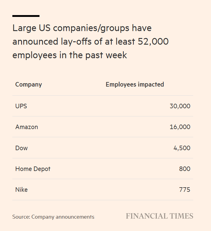 本周,美国多家大型企业公布裁员数万人的计划,这是企业在历经多年大举招聘后开始精简员工队伍的最新信号。 亚马逊(Amazon)、联合包裹服务公司(UPS)、陶氏化学(Dow)、耐克(Nike)、家得宝(Home Depot)等企业表示,合计将裁员逾5.2万人,其中数 家企业称,受经济不确定性持续影响,且人工智能领域的投资压力不断加大,公司需要精简组织架构。 | Large US companies/groups have | | --- | | announced lay-offs of at least 52,000 | | employees in the past week | | Company | Employees impacted | | | --- | --- | --- | | UPS | | 30,000 | | Amazon | | 16,000 | | Dow | | 4,500 | | Home Depot | | 800 | | Nike | | 775 | | Source: Company announcements | FINANCIAL TIME | | 各大型企业公布的裁员 ...