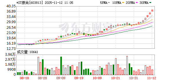 *ST原尚盘中涨停,已连收4个涨停板,截至9:50,该股报37.87元,换手率0.80%,成交量83.80万股, 成交金额3146.92万元,连续涨停期间,该股累计上涨21.57%,累计换手率为5.66%。最新A股总市值达 39.77亿元。 龙虎榜数据显示,该股因连续三个交易日内,收盘价涨幅偏离值累计达到12%的ST证券、*ST证券上榜 龙虎榜1次,买卖居前营业部中,营业部席位合计净卖出584.46万元。 | 日期 | 当日涨跌幅(%) | 换手率(%) | 主力资金净流入(万元) | | --- | --- | --- | --- | | 2025.11.11 | 5.01 | 1.66 | -790.58 | | 2025.11.10 | 5.01 | 1.46 | -15.80 | | 2025.11.07 | 5.01 | 1.74 | 104.16 | | 2025.11.06 | 4.95 | 0.88 | -228.54 | | 2025.11.05 | 0.61 | 0.52 | -31.89 | | 2025.11.04 | 2.61 | 0.97 | -331.59 | | 2025.11 ...