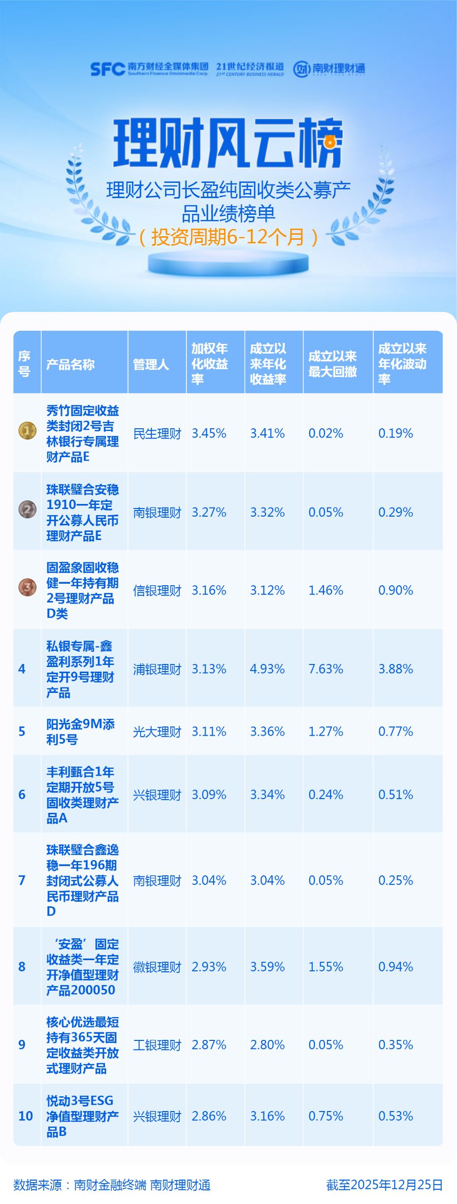 集团 21世纪经济报道 理财公司长盈纯固收类公 品业绩榜单 (投资周期6-12个月 | 10 पुर | 产品名称 | 管理人 | 加权年 化妆盖 | 同体之儿 来年化 | 成立以来 最大回撤 | 成立以来 年化波动 | | --- | --- | --- | --- | --- | --- | --- | | | | | M | 收益率 | | ਲ ਕ | | | 我们目后上所 类封闭2号吉 林银行专属理 | 民生理财 3.45% | | 3.41% | 0.02% | 0.19% | | | 财产品 | | | | | | | | 珠联璧合安稳 1910一年完 开公募人民币 | 商银步测 | 3.27% | 3.32% | 0.05% | 0.29% | | | 理财产品 | | | | | | | | 百密家固收禮 健一年指言則 2号理财产品 | 信银理财 3.16% | | 3.12% | 1.46% | 0.90% | | | D类 | | | | | | | | 私银气属-鑫 | | | | | | | | 屋引屋同1年 | | | | | | | 4 | Fat 9 = E W | 浦银理财 3 ...
