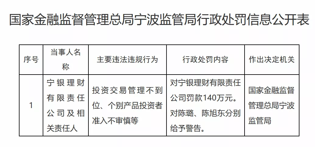 近日,国家金融监督管理总局宁波监管局披露的行政处罚信息显示,宁银理财有限责任公司因存在投资交易管理不到位、个别产品投资者准入不审 慎等主要违法违规行为,被罚款140万元,相关责任人陈璐、陈旭东分别被警告。 | 序号 | 当事人名 | 主要违法违规行为 | 行政处罚内容 | 作出决定机关 | | --- | --- | --- | --- | --- | | | 称 | | | | | | 宁银理财 | 投资交易管理不到 | 对宁银理财有限责任 | 国家余融监督 | | | 有限责任 | 位、个别产品投资者 | 公司罚款140万元。 | 管理总局宁波 | | | 公司及相 | | 对陈璐、陈旭东分别 | 监管局 | | | 关责任人 | 准入不审慎等 | 给予警告。 | | (国家金融监督管理总局) ...