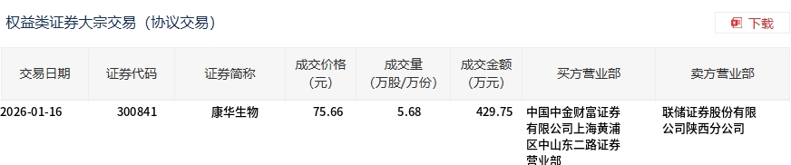 | 交易日期 | 证券代码 | 证券简称 | 成交价格 | 成交星 | 成交金额 | 买方营业部 | 卖方营业部 | | --- | --- | --- | --- | --- | --- | --- | --- | | | | | (元) | (万股/万份) | (万元) | | | | 2026-01-16 | 300841 | 康华生物 | 75.66 | 5.68 | 429.75 | 中国中金财富证券 | 联储证券股份有限 | | | | | | | | 有限公司上海黄浦 | 公司陕西分公司 | | | | | | | | 区中山东二路证券 | | | | | | | | | 章业部 | | 1月16日,康华生物大宗交易成交5.68万股,成交额429.75万元,占当日总成交额的3.3%,成交价75.66元,较市场收盘价 75.66元持平。 ...