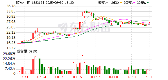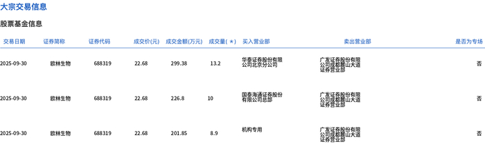 9月30日,欧林生物大宗交易成交32.1万股,成交额728.03万元,占当日总成交额的4.31%,成交价22.68 元,较市场收盘价27.2元折价16.62%。 | 交易日期 | 证券简称 | 证券代码 | | | 成交价(元) 成交金额(万元) 成交量(*) 买入营业部 | | 类出营业部 | 是否为专场 | | --- | --- | --- | --- | --- | --- | --- | --- | --- | | 2025-09-30 | 欧林生物 | 688319 | 22.68 | 299.38 | 13.2 | 华泰证券服份有限 公司北京分公司 | 公司日本最出版社 | Ka | | 2025-09-30 | 欧林生物 | 688319 | 22.68 | 226.8 | 10 | 君意義創意參與69 | 合計算出版品 | KI | | 2025-09-30 | 欧林生物 | 688319 | 22.68 | 201.85 | 8 . d | 机构专用 | 公司是在第二次 | 성 | ...
