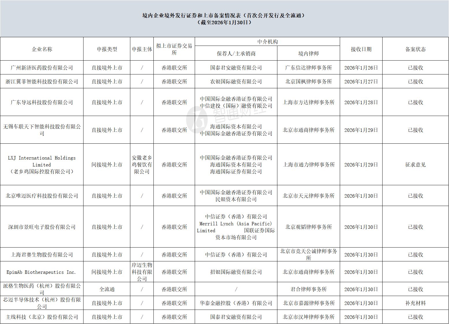 1月30日,中国证监会发布《境内企业境外发行证券和上市备案情况表(首次公开发行及全流通)(截至2026年1月30日)》,其中,新济医药、翼菲科技、导远 科技、车联天下、唯迈医疗、景旺电子(603228)、君赛生物、主线科技拟香港IPO获中国证监会接收材料;老乡鸡(间接境外上市)拟香港IPO备案状态为征 求意见;芯迈半导体拟香港IPO备案状态为补充材料。 | 境内企业境外发行证券和上市备案情况表(首次公开发行及全流通) | | --- | | (截至2026年1月30日) | | 企业名称 | 申报类型 | 申报主体 | 拟上市证券交易 | 中介机构 | | | --- | --- | --- | --- | --- | --- | | | | | 册 | 保荐人/主承销商 | 境内律师 | | 广州新济医药股份有限公司 | 直接境外上市 | 1 | 香港联交所 | 国泰君安融资有限公司 | 广东信达律师 | | 浙江翼菲智能科技股份有限公司 | 直接境外上市 | 1 | 香港联交所 | 农银国际融资有限公司 | 北京国枫律师 | | 广东导远科技股份有限公司 | 直接境外上市 | 1 | 香港联交所 | 中国 ...