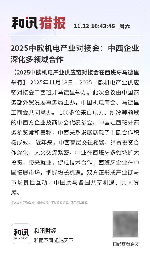 【2025中欧机电产业供应链对接会在西班牙马德里举行】2025年11月18日,2025中欧机电产业供应链对 接会于西班牙马德里举办。此次会议由中国商务部外贸发展事务局主办,中国机电商会、马德里工商会 共同承办。 100多位来自电力、制冷等领域的中西方企业及商协会代表参会。中国驻西班牙商务参赞常 和喜称,中西关系发展展现了中欧合作积极成效。 近年来,中西高层交往频繁,经贸投资合作深化, 人文交流紧密。中业在西班牙多领域扩大投资,带来就业,促成技术合作;西班牙企业在中国拓展市 场,把握增长机遇。双方正形成产业链与市场良性互动,中国愿与各国共享机遇、共同发展。 和讯财经 FOL hexun.com 和而不同 迅达天下 本文由 AI算法生成,仅作参考,不涉投资建议,使用风险自担 扫码查看原文 ...