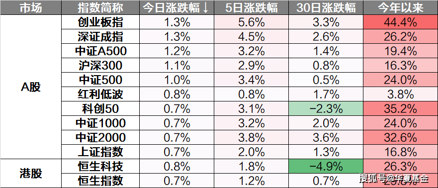 市场概况 2025年12月1日,三大指数集体收涨,其中沪指上涨0.65%,收报3914.01点;深证成指上涨1.25%,收报13146.72点;创业板 指上涨1.31%,收报3092.50点。今日两市成交额18738亿元,与上个交易日相比增加约2882亿元。 02 盘面观察 市场震荡拉升,沪指重返3900点上方,深成指、创业板指均涨超1%。核心宽基指数悉数上涨,深创100、创业板50领涨,仅 微盘股指数、科创100下跌。 | 市场 | 指数简称 | 今日涨跌幅↓ | 5日涨跌幅 | 30日涨跌幅 | 今年以来 | | --- | --- | --- | --- | --- | --- | | A股 | 创业板指 | 1.3% | 5.6% | 3.3% | 44.4% | | | 深证成指 | 1.3% | 4.5% | 2.6% | 26.2% | | | 中证A500 | 1.2% | 3.2% | 1.4% | 19.4% | | | 沪深300 | 1.1% | 2.9% | 0.8% | 16.3% | | | 中证500 | 1.0% | 3.4% | 0.5% | 24.0% | | | 红利低 ...