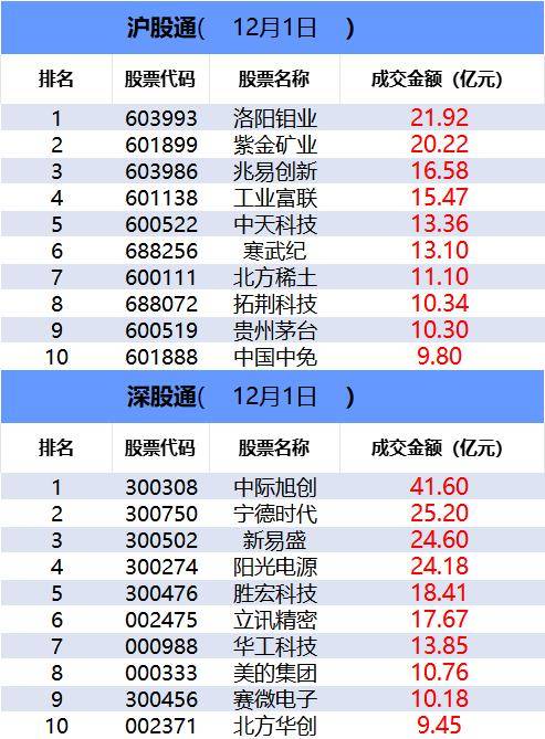一、沪深股通前十大成交 今日沪股通总成交金额为1102.72亿,深股通总成交金额为1194.91亿。 | 排名 | 板块名称 | 主力资金净流出(亿元) | 主力资金净流出率(%) | | --- | --- | --- | --- | | 1 | 电新行业 | -48.83 | -2.65 | | 2 | 电力设备 | -30.77 | -6.49 | | 3 | 计算机 | -24.43 | -1.77 | | 4 | 医药 | -21.74 | -2.44 | | 5 | 文化传媒 | -20.76 | -3.33 | 从主力板块资金监控数据来看,电子板块主力资金净流入居首。 板块资金流出方面,电新行业主力资金净流出居首。 | | 沪股道( | 12月1日 | ) | | | --- | --- | --- | --- | --- | | 排名 | 股票代码 | 股票名称 | | 成交金额(亿元) | | 1 | 603993 | 洛瑞德国V | | 21.92 | | 2 | 601899 | 三十四年 | | 20.22 | | 3 | 603986 | 兆易创新 | | 16.58 | | 4 | ...