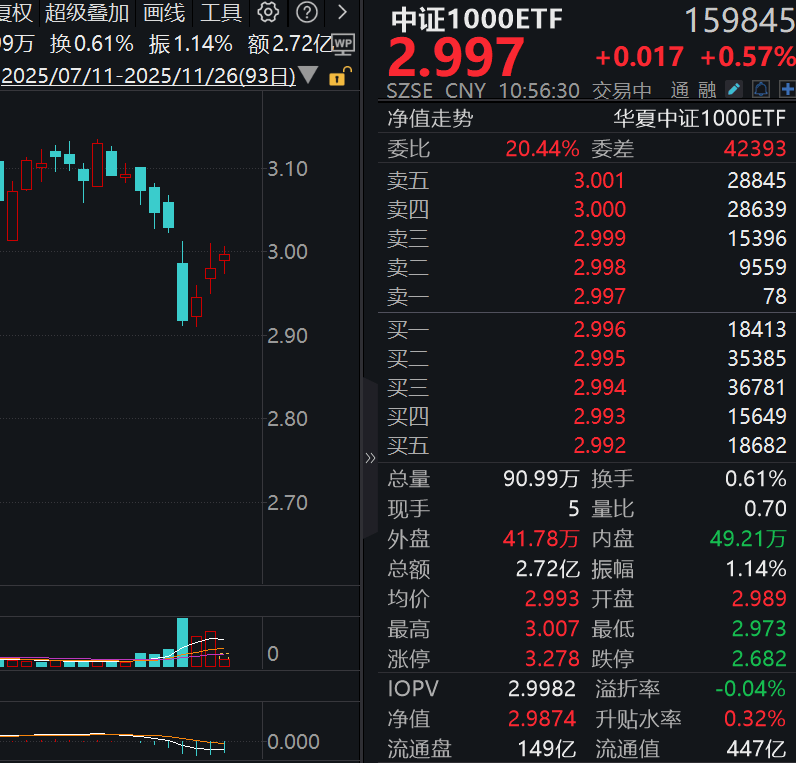 中证1000ETF(159845)上涨0.57%,近五个交易日资金净流入11.07亿元