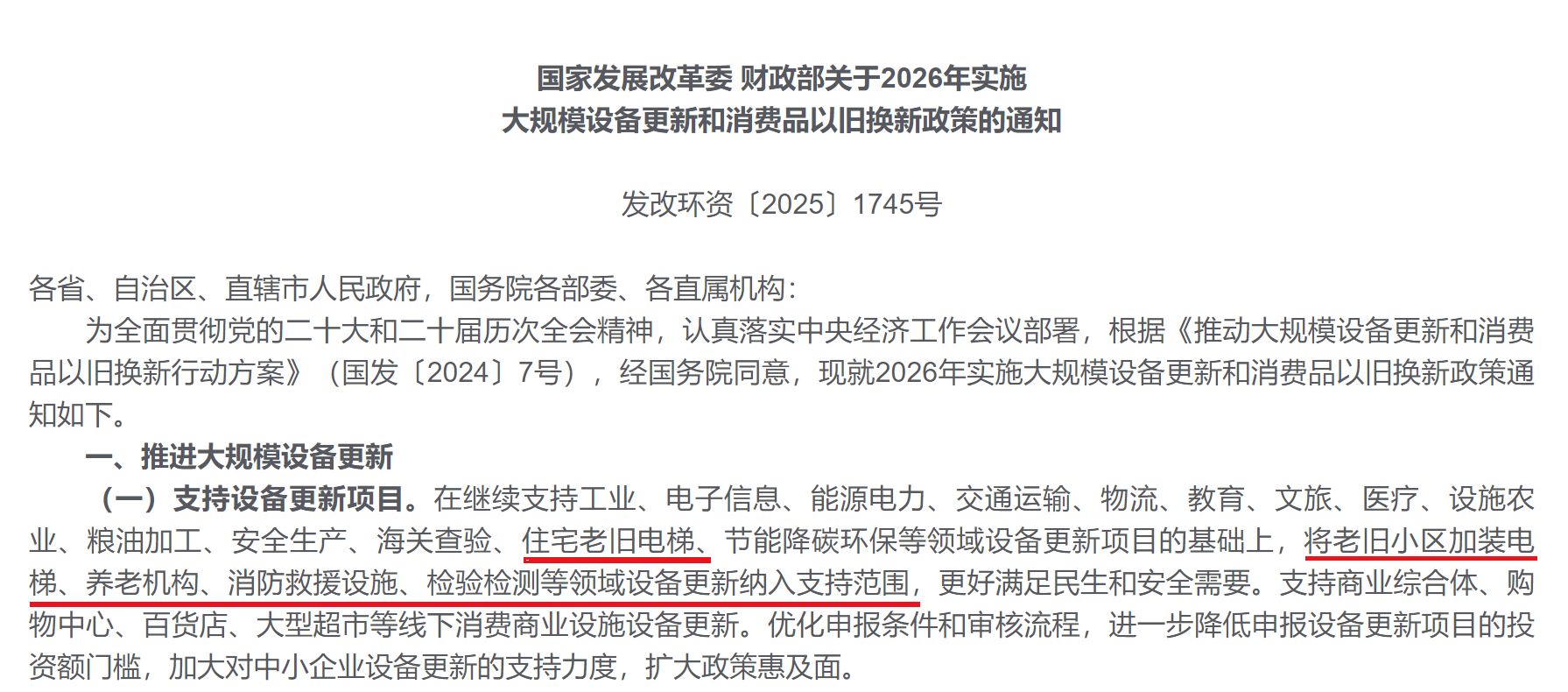 日前,国家发展改革委、财政部联合印发《关于2026年实施大规模设备更新和消费品以旧换新政策的通知》,提出从支持范围、补贴标准、实施机制等方面 优化实施2026年"两新"政策。 在总体延续2025年支持范围的基础上,主要增加三方面更新补贴,其中就包括在民生领域增加老旧小区加装电梯项目。补贴标准也更加精准,在设备更新方 面,住宅老旧电梯更新补贴也由原来的定额补贴,调整为按电梯层(站)数分档差异化补贴。 图片来源:国家发展改革委网站 1月5日,中建华宇电梯董事长丁志华在接受《每日经济新闻》记者(以下简称"每经记者")采访时表示,2026年"两新"政策将老旧小区加装电梯作为一项新 增补贴内容,这一调整是国家加码推动民生改善、释放内需潜力的重要信号。过去因资金问题而进展缓慢的加装项目有望提速,对电梯制造、安装、市场服 务等全产业链的企业都将产生直接的积极影响。国家多年来提出的解决老年人上下楼的民生痛点有望得到彻底解决。 事实上,对于老旧小区加装电梯,近年来多地一直在积极行动。仅从最新披露的数据看,"十四五"以来,北京累计完成加装电梯3391部,约3.5万户居民受 益;另据重庆市住房和城乡建设委员会消息,2025年全市同 ...