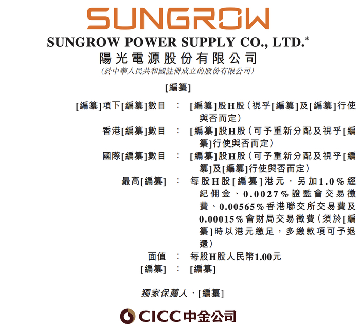 (於中華人民共和國註冊成立的股份有限公司) [編纂] 獨家保薦人·[編纂] C CICC中金公司 「編纂]項下「編纂]數目 :「編纂]股H股(視乎[編纂]及[編纂]行使 與否而定) 香港[编纂]數目 :「編纂]股H股(可予重新分配及視乎[編 纂]行使與否而定) 國際[編纂]數目 「編纂]股H股(可予重新分配及視乎[編 ·· 纂]及[編纂]行使與否而定) 每 股 H 股 [ 編 纂]港元,另加1.0%經 … 最高[編纂] 紀 用 金 · 0.0027 % 證 監 會 交 易 徵 費、0.00565% 香港聯交所交易費及 0.00015%會財局交易徵費(須於I 編 纂]時以港元繳足,多繳款項可予退 禮) 面值 : 每股H股人民幣1.00元 [編纂] : [編纂] 据港交所文件,10月5日,阳光电源股份有限公司向港交所提交上市申请书,独家保荐人为中金公司。 SUNGROW SUNGROW POWER SUPPLY CO., LTD.* 陽 光 電 源 股 份 有 限 公 司 ...
