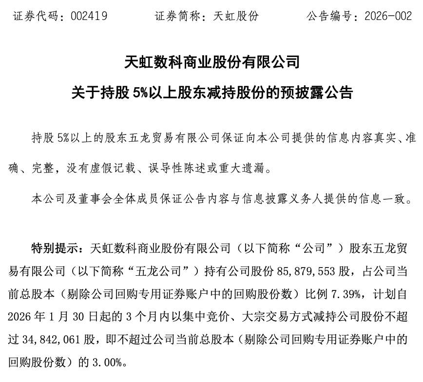 天虹股份(002419)(002419.SZ)公告,公司股东五龙贸易有限公司(简称"五龙公司")计划自2026年1月 30日起的3个月内以集中竞价、大宗交易方式减持公司股份不超过3484.21万股,即不超过公司当前总股 本(剔除公司回购专用证券账户中的回购股份数)的3.00%。 ...