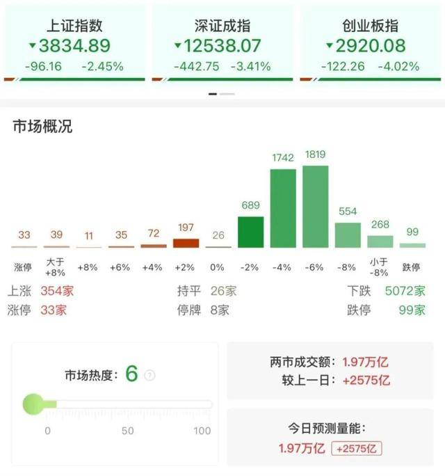 每日收评创业板指放量跌超4%,全市场不足400股飘红,近百股跌停