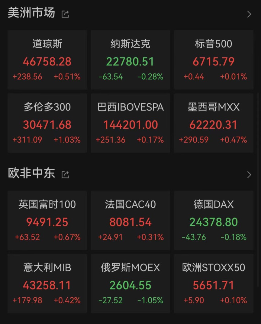 当地时间10月3日,欧洲股市多数上涨,英国富时100指数、法国CAC40指数等均小幅上涨,德国DAX指数小幅下跌。美股三大指数涨跌不一,纳斯达克 指数下跌0.28%,道琼斯工业指数、标普500指数均创历史新高。大型科技股涨跌不一,苹果、微软、谷歌-C均小幅上涨,英伟达、亚马逊、特斯拉、 META均下跌,其中META跌逾2%。 热门中概股涨跌不一,纳斯达克中国金龙指数下跌1.15%,EPSIUM ENTERPRISE涨近80%,亿鹏能源涨近50%,理想汽车、小鹏汽车等跌逾3%。现货黄 金价格涨近1%,国际原油价格上涨。 新华社消息,由于美国联邦政府"停摆",美国劳工统计局未能按计划于3日公布月度就业数据统计报告。 央视新闻消息,当地时间10月3日,美国参议院就民主党提出的临时拨款法案进行投票,最终以46票赞成、52票反对的结果,再次未能推动该法案落地。 随后,共和党提出的临时拨款法案也未能获得足够票数通过。联邦政府将继续"停摆"。 道琼斯工业指数、标普500指数创历史新高 银行股普遍上涨,摩根大通上涨0.80%,高盛集团上涨1.36%,花旗集团上涨0.38%,摩根士丹利上涨1.45%,美国银行上涨0.36%,富 ...