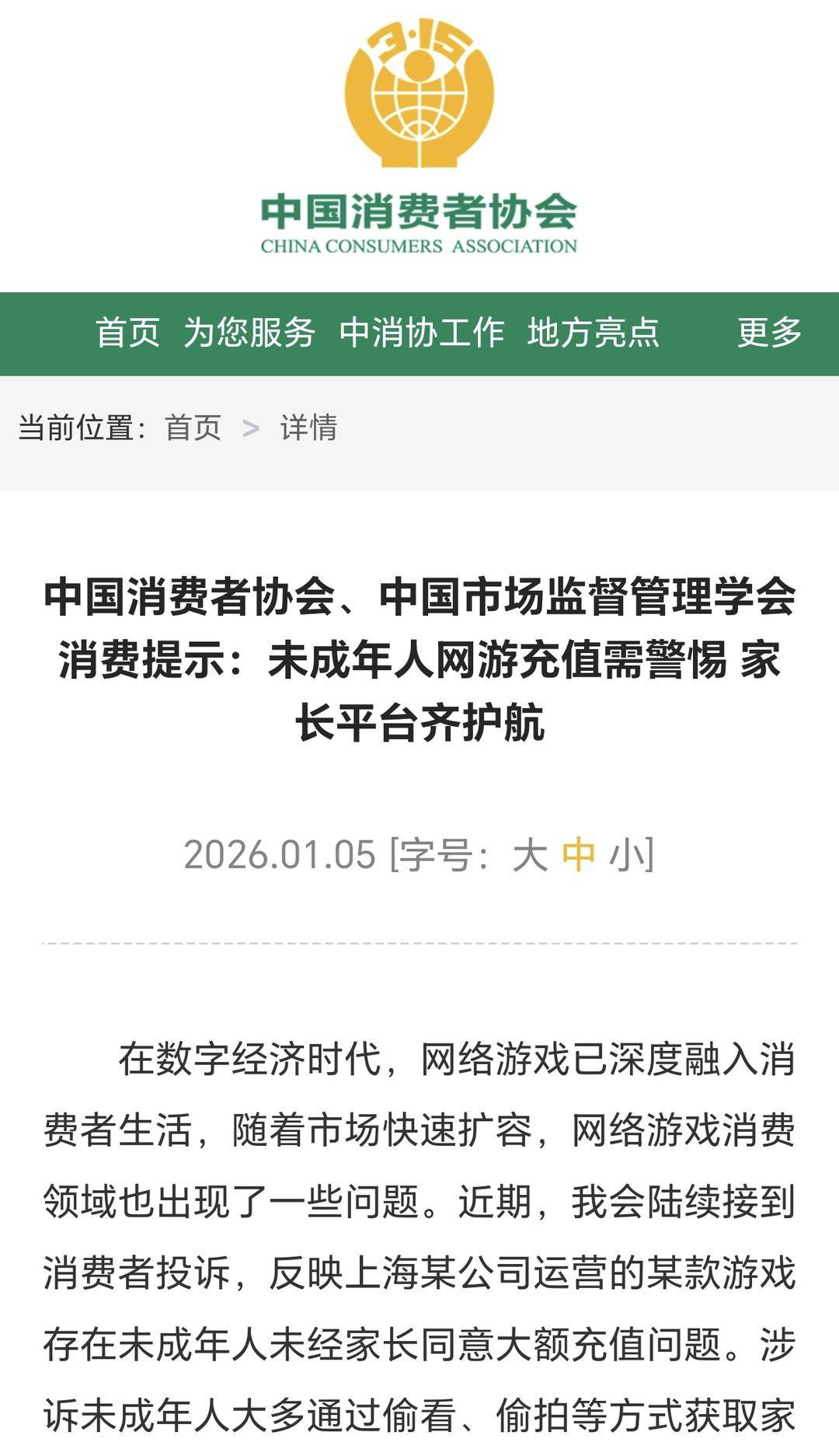 1月5日,中消协等发布消费提示,提醒未成年人网游充值需警惕,家长平台齐护航。 图源 中消协官网 近期,中消协陆续接到消费者投诉,反映上海某公司运营的某款游戏存在未成年人未经家长同意大额充值问题。涉诉未成年人大多通过偷看、偷拍等方式 获取家长支付密码,趁家长忙于工作、无暇留意手机的空隙,使用家长手机或家庭闲置手机持续充值,平均涉诉金额达2551.57元(2025年8月1日至2025 年12月10日接诉统计)。家长发现后均向涉诉公司客服要求退回款项,但未得妥善处理,客服电话也难以拨通。中消协联合中国市场监督管理学会提示: 理性看待退款纠纷,依法依规维权;平台主动履行社会责任,筑牢风控防线;加强监护教育,树立正确消费观念。 中消协认为,为促进网络游戏市场健康有序发展,降低有关消费纠纷,网络游戏平台应主动履行社会责任:一是应积极妥善处理投诉。二是在严格落实游 戏实名认证、国家防沉迷政策要求的基础上,还要进一步强化技术防护措施,精准甄别未成年人身份,防止未成年人冒用、租用、借用成年人账号进行游 戏和充值行为。三是网络游戏平台应加强充值消费管理,针对疑似未成年人操作的账户,在充值支付环节应设置更加明确有效的提醒和验证机制 ...