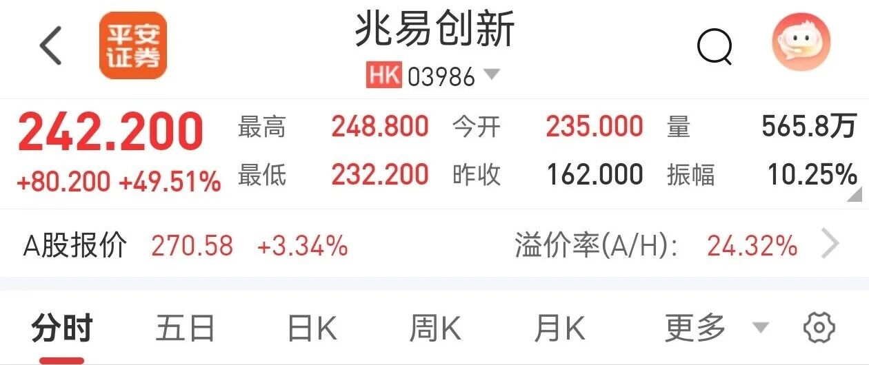 国内领先的专用型存储芯片与微控制器设计公司兆易创新今日正式在香港联合交易所主板挂牌上市,股票代码[03986.HK]。此次上市标志着这家已在A股 市场耕耘近八年的芯片设计龙头,正式开启"A+H"双资本市场平台的新篇章。 | 09:49 N | | | * 0 ' 2 ... Il ... 83 .. | | | | --- | --- | --- | --- | --- | --- | | | | 兆易创新 | | | | | | | HK 03986 ▼ | | | | | 242.200 最高 | | 248.800 今开 | 235.000 量 | | 565.8万 | | +80.200 +49.51% 取扱 | | 232.200 昨收 | 162.000 振幅 | | 10.25% | | A股报价 270.58 +3.34% | | | 溢价率(A/H):24.32% | | | | 分时 王日 | | 周K 月K | | 更多 ▼ (0) | | | 价 242.200 幅 49.51% 均 229.313 量 9501 | | | | | | | 148.800 | | | _53.58% ...