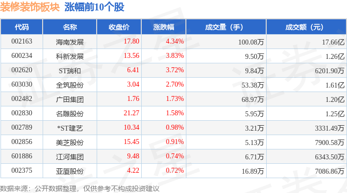 从资金流向上来看,当日装修装饰板块主力资金净流出1.29亿元,游资资金净流出4622.55万元,散户资 金净流入1.75亿元。装修装饰板块个股资金流向见下表: | 代码 | 名称 | 收盘价 | 涨跌幅 | 成交量(手) | 成交额(元) | | --- | --- | --- | --- | --- | --- | | 603828 | ST柯利达 | 7.42 | -1.20% | 11.52万 | - 8479.43万 | | 600234 | 科新发展 | 13.06 | -1.06% | 4.47万 | 5889.09万 | | 002620 | ST瑞和 | 6.18 | -0.48% | 10.15万 | 6345.81万 | | 002811 | 郑中设计 | 16.61 | -0.36% | ﻛ 5.18万 | 8596.91万 | | 002822 | ST中装 | 3.73 | -0.27% | 25.15万 | 9515.52万 | | 002789 | *ST建艺 | 10.24 | 0.10% | 3.20万 | 3261.74万 | | 002081 | 金螳螂 | 3.76 | ...
