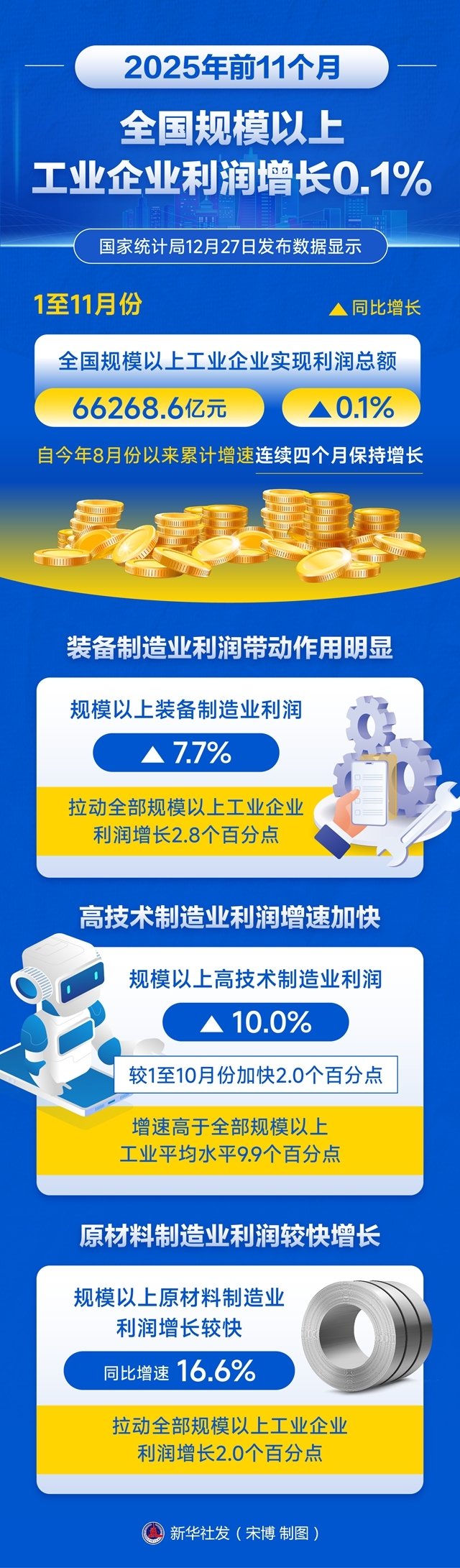 "总体看,规模以上工业企业利润延续增长态势,工业新动能的支撑作用进一步显现。"国家统计局工业 司首席统计师于卫宁表示。 装备制造业的8个大类行业中,有7个行业利润实现同比增长。1至11月,铁路船舶航空航天、电子行业 利润达到两位数增长,增速分别达27.8%和15.0%;汽车行业利润增长7.5%,较1至10月加快3.1个百分 点。 高技术制造业利润增速也加快。1至11月,规模以上高技术制造业利润同比增长10.0%,较1至10月加快 2.0个百分点,增速高于全部规模以上工业平均水平9.9个百分点。 "人工智能+"行动深入实施,带动相关行业利润向好。1至11月,智能消费设备制造行业利润同比增长 54.0%,其中智能车载设备制造、智能无人飞行器制造、其他智能消费设备制造行业利润同比分别增长 105.7%、76.6%和58.1%。 原材料制造业利润也实现较快增长。1至11月,规模以上原材料制造业利润增长较快,同比增速达 16.6%,拉动全部规模以上工业企业利润增长2.0个百分点。 工业企业利润累计增速连续四个月保持增长。国家统计局12月27日公布的数据显示,前11个月规模以上 工业企业利润同比增速为0.1%,虽较前10 ...