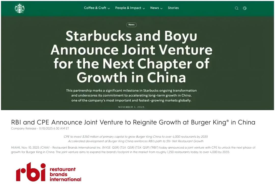 Core Insights - Following Starbucks' transfer of its controlling stake in China, Burger King's parent company RBI has also entered into a strategic partnership with CPE Yuanfeng to establish a joint venture, Burger King China, thereby transferring its controlling stake in the Chinese market [1][2] Group 1: Strategic Partnership - CPE Yuanfeng will inject an initial capital of $350 million into Burger King China to support restaurant expansion, marketing, menu innovation, and operational improvements [1] - After the transaction, CPE Yuanfeng will hold approximately 83% of Burger King China, while RBI will retain about 17% [1] Group 2: Market Adaptation - The establishment of joint ventures with local investment institutions is becoming a new paradigm for foreign brands in China, enhancing their adaptability to the local market [2] - The ability of these brands to maintain global brand consistency while responding flexibly to rapidly changing local consumer demands remains to be observed [2] Group 3: Growth Plans - CPE Yuanfeng aims to empower Burger King China by focusing on product upgrades, brand marketing, store expansion, online channel restructuring, digital system development, and financial optimization [3] - The plan includes expanding the number of Burger King stores in China from approximately 1,250 to over 4,000 by 2035, along with achieving sustainable same-store growth [3] Group 4: Confidence in Market Potential - CPE Yuanfeng's investment reflects confidence in Burger King's long-term growth potential in China, leveraging its deep understanding of local consumers [3] - RBI's CEO emphasized that China remains one of the most attractive long-term growth markets for Burger King globally, and the partnership with CPE Yuanfeng is expected to unlock significant growth potential for the brand in China [3]