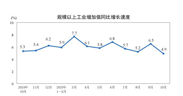 受去年同期基数抬升、外部不确定性加大等因素影响,10月份多项宏观经济指标增速出现波动。 国家统计局11月14日发布的数据显示,10月份,规模以上工业增加值同比增长4.9%,增速较9月放缓1.6 个百分点;社会消费品零售总额同比增长2.9%,较9月小幅回落0.1个百分点。1-10月份,全国固定资产 投资(不含农户)408914亿元,同比下降1.7%。 财信金控首席经济学家伍超明对第一财经表示,往后看,新质生产力稳步发展、新型政策性金融工具、 5000亿地方政府债务结存限额等政策发力显效,有望继续对工业生产形成支撑;但经济"供强需弱"矛盾 依旧突出,加上出口放缓压力加大和基数抬升,工业生产增速大概率继续稳中有降。 服务消费成为重要增长点 国家统计局新闻发言人付凌晖在国新办发布会上表示,总的来看,10月份国民经济运行总体平稳,转型 升级扎实推进,发展新动能继续壮大。也要看到,外部环境不稳定不确定因素较多,国内结构调整压力 较大,经济平稳运行面临不少挑战。下阶段,要全方位扩大国内需求,着力稳就业、稳企业、稳市场、 稳预期,积极推动宏观政策持续落地增效。 工业增速高位放缓 今年以来,尽管国际环境复杂严峻,国内市场竞争压 ...