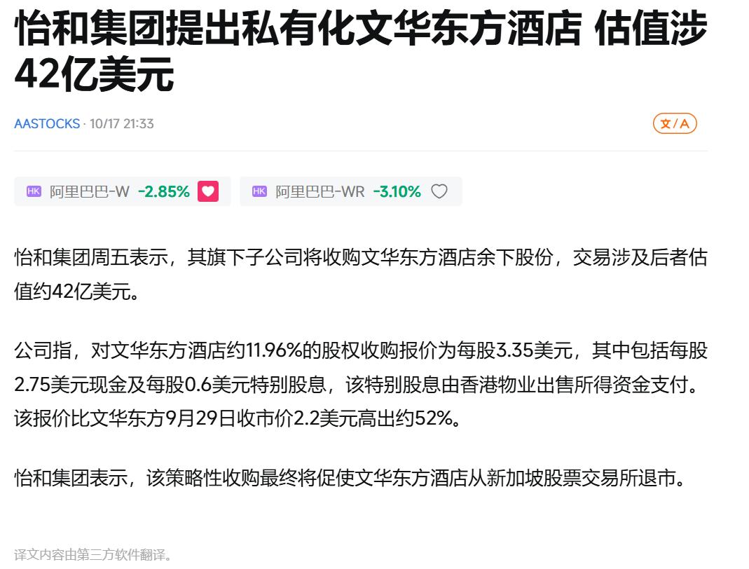 1 这两天酒店圈有个大事。 文华东方,就是那个住一晚能顶很多人一个月工资的奢牌酒店,被母公司怡和集团用42亿美元打包带走,从新加坡股市私有化退市了。 顺便还把自己在香港铜锣湾"港岛壹号中心"最顶13层楼面,卖给了阿里巴巴,套现9.25亿美元。 一边退市,一边卖楼。 朋友圈立马分成了两派。 一拨人觉得这步棋走得妙: 彻底摆脱股市的绑架,不用再为了每个季度的财报当孙子,可以安心搞品牌、做长期战略了。 另一拨人觉得文华东方这就是混不下去了: 明明就是股价长期半死不活,盈利能力被同行吊打,上市混不下去才被迫退市,这就是战略收缩。 那么问题来了,文华东方这波操作,到底是"资本妙棋",还是"无奈之举"? 坦率说,挺文华东方的这批人共情能力挺强的,也确实懂上市公司的无奈。 你以为上市之后的自己是霸道总裁。 其实是天天被一帮华尔街之狼围着,每个季度问你:"这季度挣了多少钱?下季度能挣更多吗?不能?那你是不是不行了?" 文华东方就这处境。 退市之后相当于耳根子清静了。 2 首先,最直观的一点,它终于不用再"quarterly 交作业"了。 你想想,上市公司像个啥? 就像个被24小时直播的网红,还要每个季度都得在股东、分析师面前 ...
