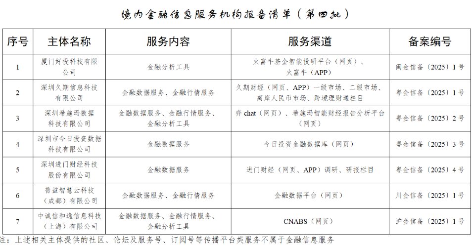 格隆汇2月15日|根据《关于开展境内金融信息服务报备工作的通知》,国家互联网信息办公室组织开展境内金融信息服务报备工作。 近日已公布第四批7家金融信息服务机构名称及报备编号,进门财经、久期财经等机构在列。 | 序号 | 主体名称 | 服务内容 | 服务渠道 | 备案编号 | | --- | --- | --- | --- | --- | | 1 | 厦门好投科技有限 | 金融分析工具 | 火富牛基金智能投研平台(网页)、 | 闽金信备(2025)1号 | | | 公司 | | 火富牛(APP) | | | 2 | 深圳久期信息科技 | 金融数据服务、金融行情服务 | 久期财经(网页、APP)一级市场、二级市场、 | 粤金信备(2025) 1 号 | | | 有限公司 | | 离岸人民币市场、跨境理财通栏目 | | | 3 | 深圳希施玛数据 | 金融数据服务、金融行情服务、 | 弈 chat(网页)、希施玛智能财经报告分析平台 | 粤金信备(2025)2号 | | | 科技有限公司 | 金融分析工具 | (网页) | | | 4 | 深圳市今日投资数据 | 金融数据服务 | 今日投资金融数据库(网页) | 粤 ...