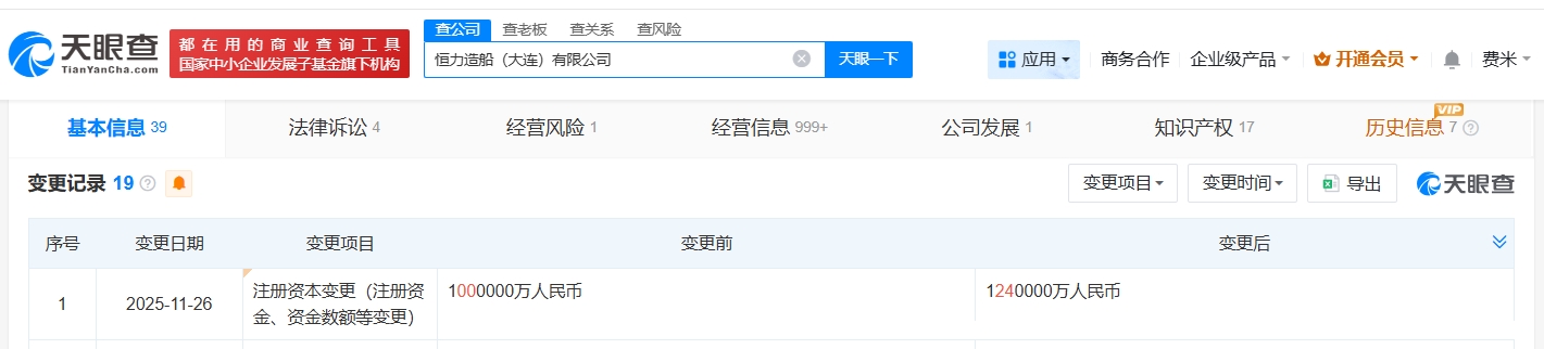 | 天眼堂 | 都在用的商业查询工具 | | 查老板 童关系 更公司 | 童风险 | | | | | | --- | --- | --- | --- | --- | --- | --- | --- | --- | | 国家中小企业发展子基金旗下机构 | | | 恒力造船(大连)有限公司 | | × | 天眼一下 | 品 应用 ▼ | 商务合作 | | 基本信息 39 | | 法律诉讼 4 | 经营风险 1 | 经营信息 999+ | | | 公司发展 | 知识 | | 股东信息 1 2 ● 品 股权结构 | | | | | | | | 园 数据纠错 | | 序号 | | | 股东名称 | | | | 持股比例 ៖ | 认缴出资额(万 | | 恒力 | 恒力重工集团有限公司 品 | | | | | | 100% | 12 | | 更 | 控股股东 | 并购融资 | | | | | | | 每经AI快讯,天眼查工商信息显示,近日,恒力造船(大连)有限公司发生工商变更,注册资本由100亿元人民币增至124亿元人民币,增幅24%。恒力造船(大 连)有限公司成立于2022年7月,法定代表人为安锦香,经营范围包括非金属船 ...