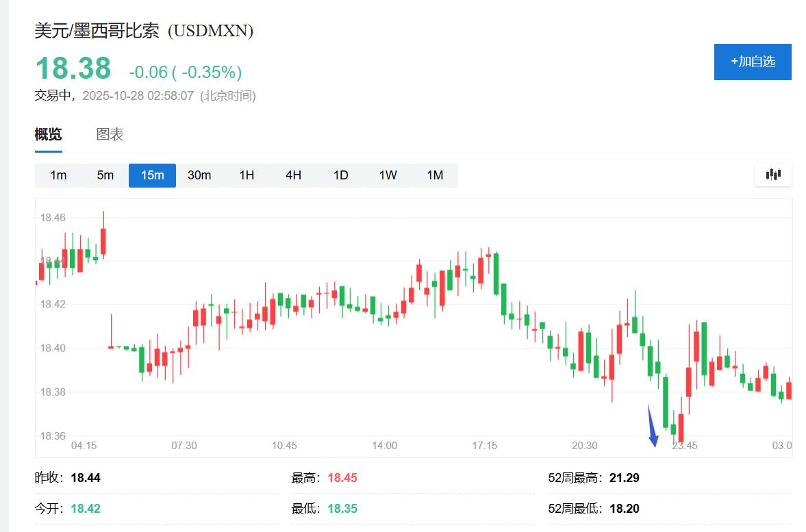 美东时间27日周一,墨西哥总统辛鲍姆在新闻发布会上表示,她与特朗普上周六简短通话,双方同意延长谈判时间,以便就仍在讨论的非关税贸易壁垒达成 协议。她表示,"目前不存在11月1日加征任何特别关税的情况",双方接近达成协议,并同意在未来几周再次通话。特朗普原定11月1日将针对特定墨西哥商 品的芬太尼相关关税从25%提高至30%。 辛鲍姆发表上述言论后,墨西哥比索汇率升至日内高位,美元兑比索在美股早盘时段曾跌破18.40刷新日低,日内跌近0.5%。渣打银行经济学家Dan Pan表 示,有关谈判进展的评论"提振了市场对墨西哥在与美国贸易谈判中处于相对有利地位的乐观情绪,尤其考虑到其对美国市场的高度依赖"。 与此形成对比的是,特朗普本周一在从马来西亚去往日本的空军一号上明确表示,不想在访问亚洲期间与加拿大总理卡尼会面。按日程,卡尼和特朗普均将 出席本周在韩国举行的APEC峰会。特朗普说: "我不想见他(卡尼)。我们一段时间内不会与他们(加拿大)会谈。我对目前与加拿大的协议非常满意,我们会让它继续下去。" 美国总统特朗普对两个邻国的贸易谈判态度出现明显分化。他同意将美国与墨西哥达成贸易协议的截止期推迟数周,对加拿大则表示 ...