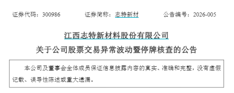 记者丨刘雪莹 编辑丨曾静娇 1月12日晚,志特新材(300986)公告称,公司股票自2026年1月5日至1月12日连续6个交易日 涨停,涨幅为 198.57% ,股价波动较大。为维护投资者利益, 公司将就股票交易波动情况进 行核查 ,股票自1月13日开市起停牌,预计停牌时间不超过3个交易日。 公司提醒广大投资者 注意二级市场交易风险。 公司同时明确,不存在关于公司应披露而未披露的重大事项,也不存在处于筹划阶段的重大事 项。公司及子公司生产经营正常,主营业务目前未发生重大变化。 志特新材是2026年A股首只翻倍股,也是年内涨幅最大的股票, 截至1月12日已6连20cm涨 停,近20个交易日涨近230%。 志特新材分别在1月8日和6日发布了股票交易异常波动公告。 志特新材属于铝行业,是AI应用、量子计算概念股。近日被称之为"科技春晚"的《中国科技创 新盛典》正式播出,志特新材代理的防火隔热材料产品在节目中亮相。( 详情 ) (声明:文章内容仅供参考,不构成投资建议。投资者据此操作,风险自担。) SFC 出品 | 2 1财经客户端 2 1世纪经济报道 商业航天ETF爆发,有人7天收益够交1个月房租,多家上市公司紧急 ...