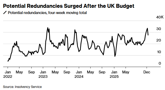 智通财经APP获悉,英国工人正面临近三年来最严峻的失业风险,预算案公布后劳动力市场的恶化趋势 很可能引起英国央行的警觉,并加剧该央行进一步降息的压力。据英国破产署的数据,截至去年12月14 日的四周内潜在裁员人数(预示未来裁员趋势的先行指标)飙升至33,392人,创下2023年初以来最高值, 也是疫情后的第二高水平。这一数据尤其令人担忧,因为历史数据显示,每年12月裁员数量通常趋于缓 和。然而,裁员形势在英国财政大臣里夫斯公布秋季预算案后于上月显著恶化。 尽管英国央行代理人网络反馈显示,企业主要通过自然减员而非主动裁员来缩减规模,但当前裁员数据 表明,越来越多企业正采取积极裁员措施。数据显示,英国2025年末收到裁员通知的人数较年内平均水 平高出近50%。 英国央行决策者小组的调查显示,企业预计2026年将进一步缩减用工规模。涵盖2025年第四季度的数据 显示,企业预测就业率将下降0.4%,创2020年以来最差纪录。 劳动力市场动荡加剧的迹象,将强化英国央行决策者在规划后续政策空间时于2026年持续降息的依据。 荷兰国际集团(ING)发达市场经济学家詹姆斯·史密斯指出:"若此类数据开始攀升,将为英国央行加速 ...