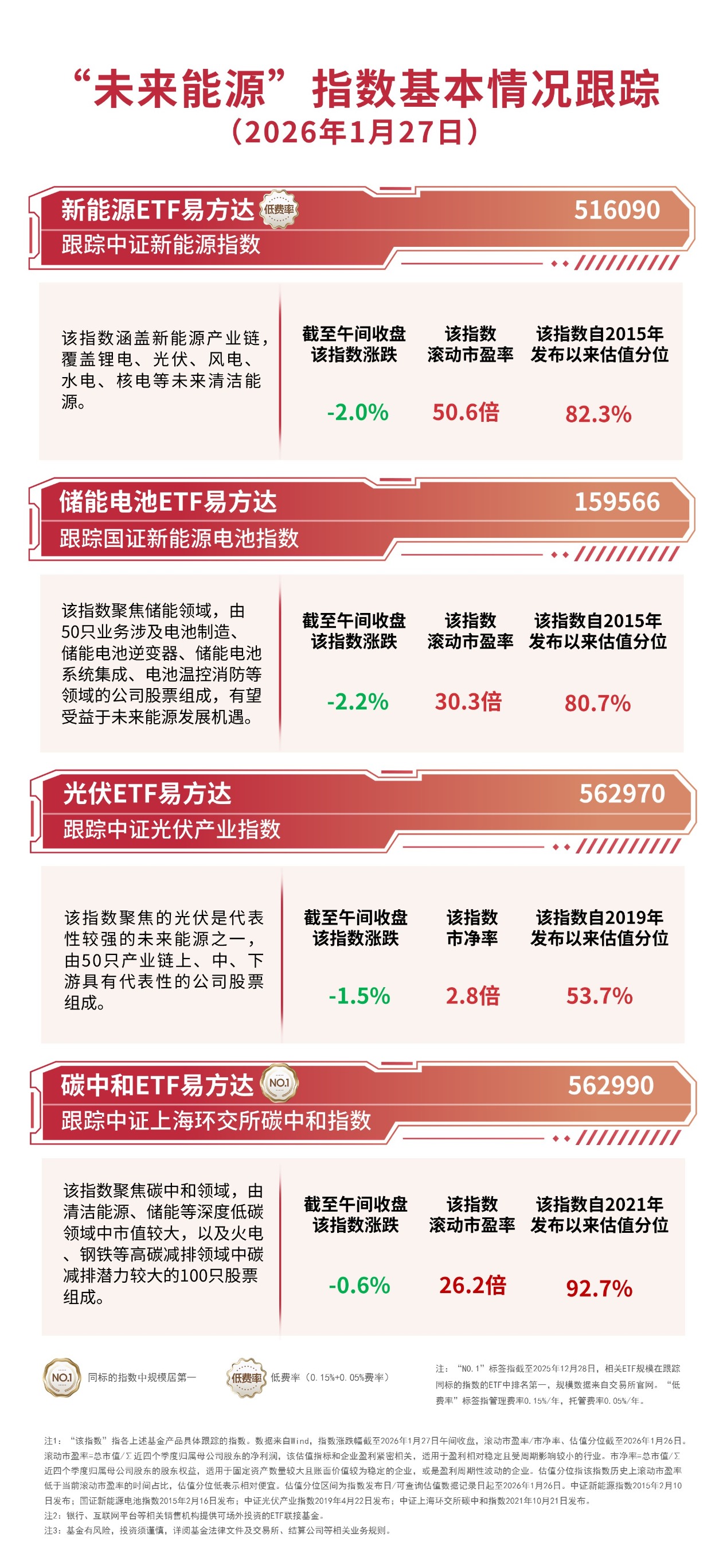今日早盘,新能源板块震荡调整。截至午间收盘,中证新能源指数下跌2%,国证新能源电池指数下跌2.2%,中证光伏产业指数下跌1.5%,中证上海环交所 碳中和指数下跌0.6%,资金逆势布局,储能电池ETF易方达(159566)半日净申购达2500万份。 | 该指数聚焦的光伏是代表 | 截至午间收盘 | 该指数 | 该指数自20 | | --- | --- | --- | --- | | 性较强的未来能源之一, | 该指数涨跌 | 市净率 | 发布以来估值 | | 由50只产业链上、中、下 | | | | | 游具有代表性的公司股票 组成。 | -1.5% | 2.8倍 | 53.7% | (文章来源:每日经济新闻) | 新能源ETF易方达 雙 | | | 5160 | | --- | --- | --- | --- | | 跟踪中证新能源指数 | | | | | | | | .. ///// | | 该指数涵盖新能源产业链, | 截至午间收盘 | 该指数 | 该指数自20. | | 覆盖锂电、光伏、风电、 | 该指数涨跌 | 滚动市盈率 | 发布以来估值 | | 水电、核电等未来清洁能 | | | | | 濃。 | ...