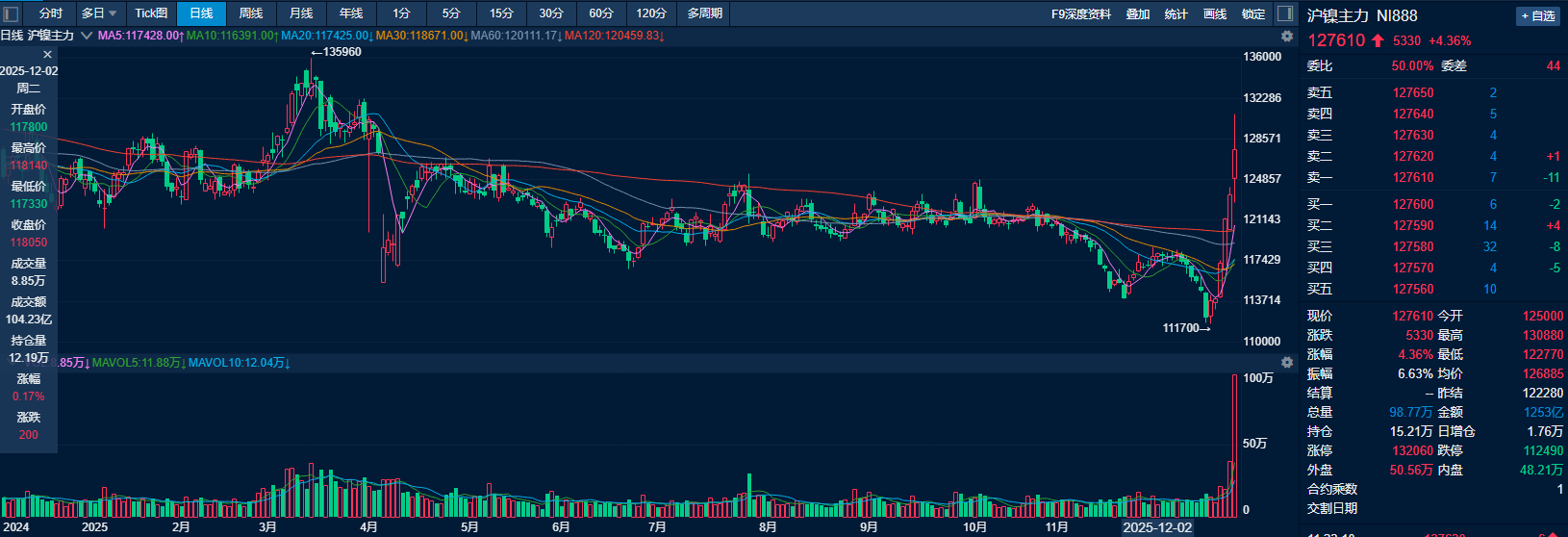 撰稿:史玥明 从业资格:F03097365 热点栏目 自选股 数据中心 行情中心 资金流向 模拟交易 客户端 周五,沪镍一改此前低迷格局,领涨国内有色系,盘中最大涨幅超3%,品种换月动作加快。消息面来 看,印尼镍矿商协会(APNI)透露,2026 年工作计划和预算(RKAB)中提出的镍矿石产量或将约为 2.5 亿吨,较 2025 年 RKAB 中 3.79 亿吨的产量目标大幅下降;APNI披露,能源与矿产资源部计划于 2026 年初修订镍商品的矿产基准价格(HPM)计算公式。据 APNI 透露,此次修订的重点之一在于, 政府将开始把镍伴生矿物(如钴)作为独立矿种加以计价,并对其征收版税。成本抬升预期推动镍价今 日反弹,后续继续关注印尼政策变动的落地情况。 基本面来看,传统产业链方面,镍铁价格维稳,不锈钢现货市场成交氛围好转,全国主流市场不锈钢89 仓库口径社会总库存106.36万吨,周环比下降1.55%。新能源产业链方面,原料受镍价下行叠加年终将 至,低价货出现进一步拖累价格中枢,同时,需求边际转弱,12月三元前驱体排产环比下降。国内一级 镍库存累库再现。因此,镍元素基本面过剩格局未改,偏弱的需求及较高的库存 ...