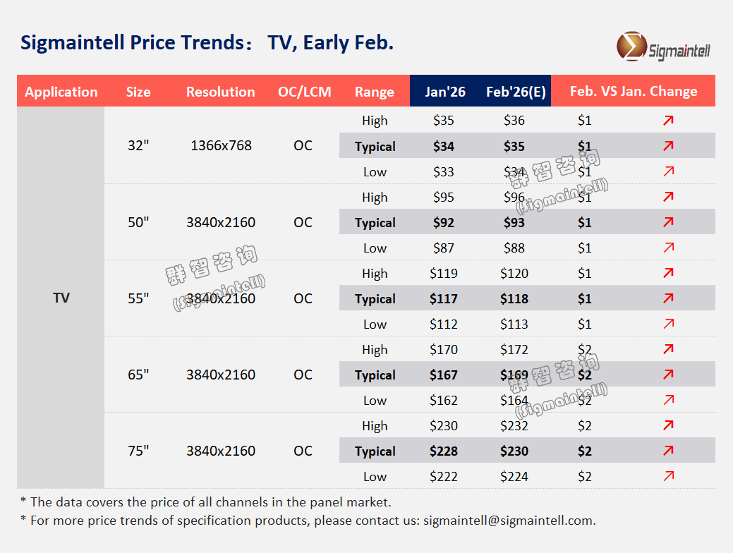 大尺寸方面,G10.5控产力度较强叠加品牌采购需求恢复,1月面板均价温和上涨,预计2月均价涨幅扩大至2美金。 32",短期以抄底需求为主,1月面板均价小幅上涨1美金,预计2月维持该涨势。 50",供应受超大尺寸挤压,1月面板均价小幅上涨1美金,预计2月上涨1美金。 55",需求好于预期推动供需回归平衡,1月小幅上涨1美金,预计2月持续上涨1美金。 群智咨询发文称,二月,赛事备货与成本备货是需求阶段性向好的两大主要因素,加之面板供应收窄,全球液晶电视面板价格步入上行周期。从需 求端来看,成本上涨是推动品牌采购节奏持续性前移的核心因素,因此一季度面板需求降温力度收缩。群智咨询认为,供需两端的协同调整加速市 场向供需平衡状态回归。 当前,存储芯片价格大幅上涨与面板价格同步进入涨价周期,成本焦虑影响品牌被动前移采购需求以锁定库存成本。因此,以利润为核心指标的品 牌厂商采购策略相对谨慎,而头部品牌在兼顾份额和获利的诉求下采购策略相对稳健。从供应端来看,春节控产力度受需求影响有所收窄,但一季 度面板供应体量依然呈现环比下降。 各尺寸表现如下: | Application | Size | Resolution | OC/ ...