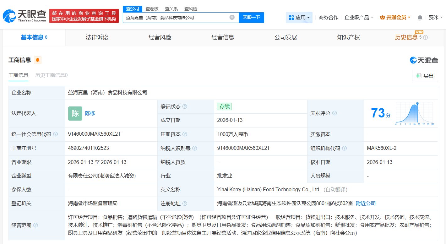 每经AI快讯,天眼查工商信息显示,近日,益海嘉里(海南)食品科技有限公司成立,法定代表人为陈栋,注册资本1000万元人民币,经营范围包括食品 销售、道路货物运输、货物进出口等。股东信息显示,该公司由金龙鱼(300999)全资持股。 ...