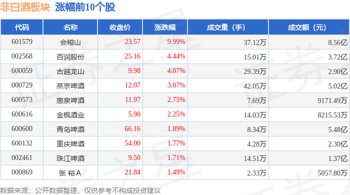 证券之星消息,11月10日非白酒板块较上一交易日上涨2.67%,会稽山领涨。当日上证指数报收于 4018.6,上涨0.53%。深证成指报收于13427.61,上涨0.18%。非白酒板块个股涨跌见下表: | 代码 | 名称 | 收盘价 | 涨跌幅 | 成交量(手) | 成交额(元) | | --- | --- | --- | --- | --- | --- | | 601579 | 会稽山 | 23.57 | 9.99% | 37.12万 | 8.56 Z | | 002568 | 自润股份 | 25.16 | 4.44% | 15.01万 | 3.72亿 | | 600059 | 古越龙山 | 9.98 | 4.07% | 29.39万 | 2.90 Z | | 000729 | 咸京啤酒 | 12.07 | 3.07% | 42.05万 | 5.02亿 | | 600573 | 飘船船舶 | 11.97 | 2.75% | 7.69万 | 9171.49万 | | 600616 | 金枫酒业 | 5.90 | 2.25% | 14.03万 | 8215.53万 | | 600600 | 顾些啦啦 | 66. ...