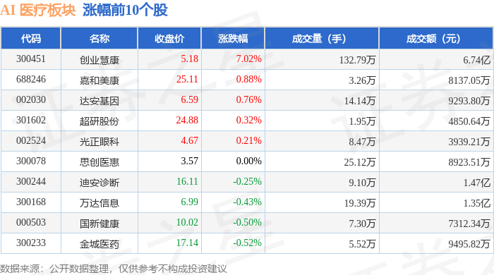 | 代码 | 名称 | 收盘价 | 涨跌幅 | 成交量(手) | 成交额(元) | | --- | --- | --- | --- | --- | --- | | 301230 | 泓博医药 | 31.72 | -2.82% | 2.38万 | 7569.58万 | | 603716 | 塞力医疗 | 22.51 | -2.76% | 13.17万 | 2.95亿 | | 300725 | 药石科技 | 39.73 | -2.60% | 6.85万 | 2.73亿 | | 300244 | 迪安诊断 | 16.16 | -1.76% | 11.39万 | 1.85亿 | | 300298 | 三诺生物 | 18.56 | -1.49% | 5.95万 | 1.11亿 | | 301602 | 超研股份 | 24.58 | -1.48% | 1.90万 | 4662.45万 | | 300233 | 金城医药 | 17.60 | -1.40% | 8.61万 | 1.53亿 | | 300676 | 华大基因 | 48.40 | -1.37% | 3.82万 | 1.85亿 | | 688222 | 成都先导 ...