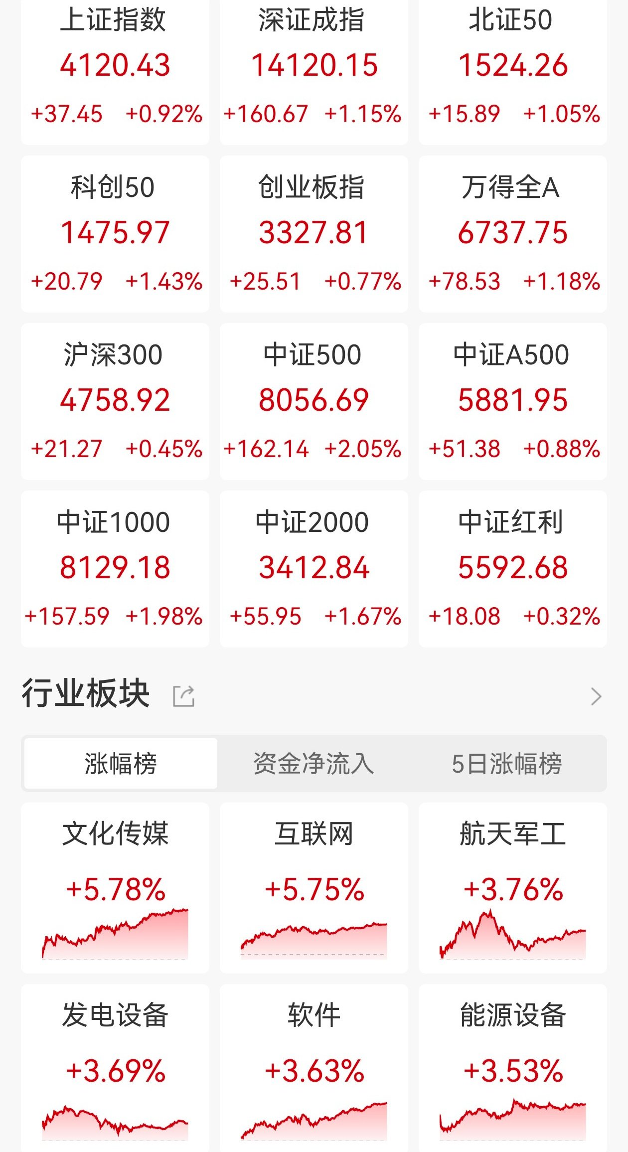 Core Viewpoint - The A-share market experienced a collective rise, with the Shanghai Composite Index surpassing 4100 points, marking a 16-day consecutive increase, indicating strong market momentum and investor confidence [1]. Market Performance - The Shanghai Composite Index closed at 4120 points, up 0.92%, while the Shenzhen Component Index rose by 1.15% and the ChiNext Index increased by 0.77% [1]. - The total market turnover reached 3.15 trillion yuan, an increase of 326.1 billion yuan compared to the previous trading day, with over 3900 stocks rising and more than 100 stocks hitting the daily limit [1]. Sector Performance - The AI application sector saw significant gains, with Kimi concepts, Sora concepts, and AI corpus leading the charge, resulting in multiple stocks like Yidian Tianxia and Zhejiang Wenlian hitting the daily limit [1]. - The commercial aerospace and satellite internet sectors remained active, with stocks such as Qianzhao Optoelectronics and China Satellite Communications also reaching the daily limit [1]. - The small metals sector was lively, with companies like Xiamen Tungsten rising sharply [1]. - Other notable sectors with strong performance included cultural media, Xiaohongshu concepts, online gaming, and online education [1]. - Conversely, the photovoltaic equipment sector declined, with Hongyuan Green Energy nearing a limit down, and the glass and fiberglass sectors weakened, with Kaide Quartz dropping over 7% [1]. Top Gainers and Fund Flow - The cultural media sector led the gainers with a rise of 5.78%, followed closely by the internet sector at 5.75% and the aerospace military sector at 3.769% [2]. - In terms of net capital inflow, the internet and aerospace military sectors also showed strong performance, indicating robust investor interest [2].