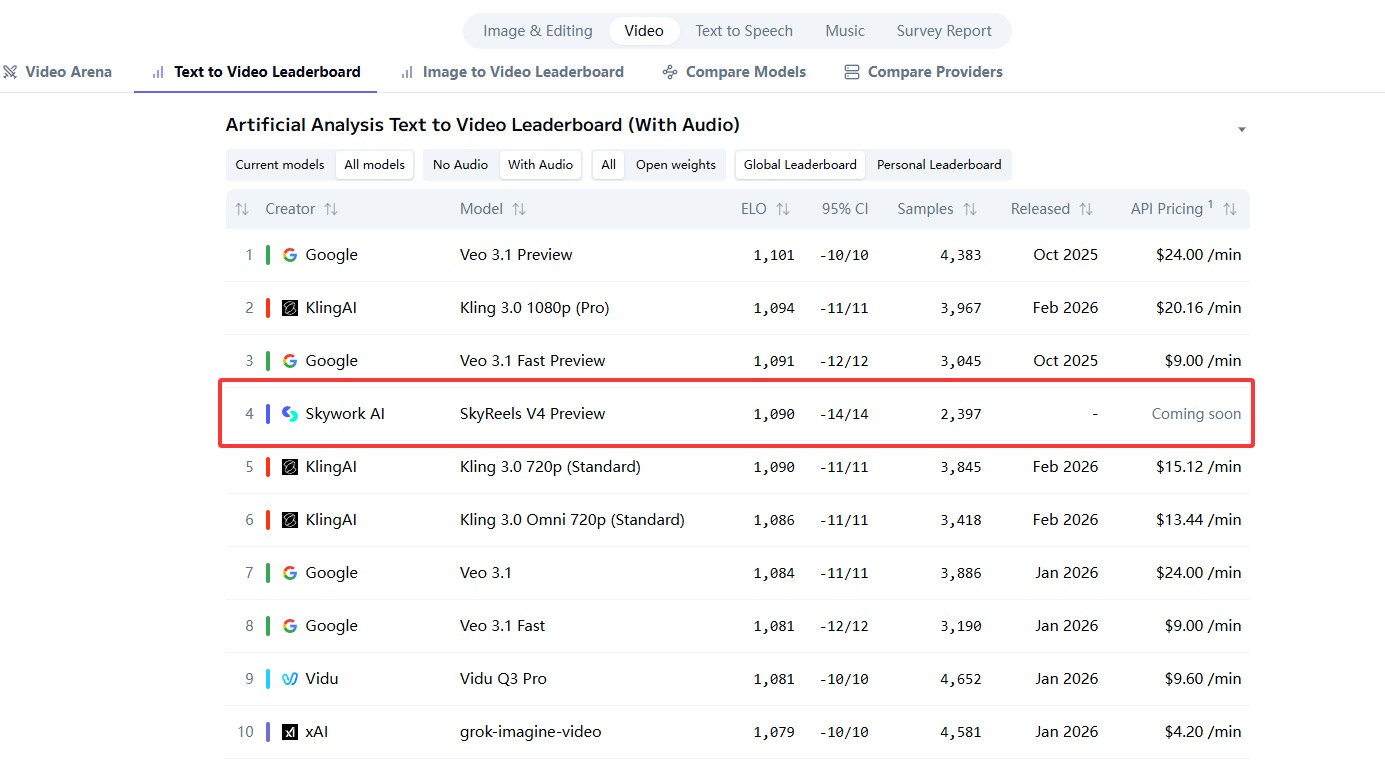 中国的视频大模型,又发起了一场技术突围。 2月27日,昆仑万维(300418)集团旗下Skywork AI正式发布多模态视频基础模型SkyReels V4。据称,该模型系"全球首个同时支持多模态输入、联合音视 频生成、统一生成/修复/编辑任务"的视频基础模型。 为此,观察者网查询第三方AI大模型评测机构Artificial Analysis发现,SkyReels V4目前在该机构"文生视频(带音频)的所有历史模型"排行榜中,位列第四 名,已超过绝大多数明星产品。 | | | | Image & Editing | Video Text to Speech | | Music | Survey Report | | | --- | --- | --- | --- | --- | --- | --- | --- | --- | | Video Arena - | Text to Video Leaderboard | | Il Image to Video Leaderboard | of Compare Models | | | a Compare Providers | | | | | | Artificia ...