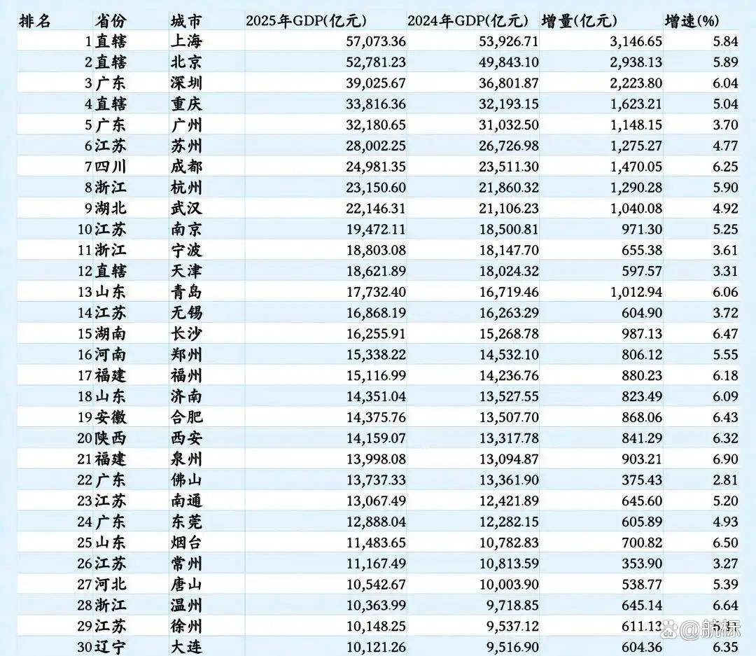 Core Insights - The 2025 GDP ranking of cities shows that the Yangtze River Delta, Pearl River Delta, Chengdu-Chongqing, and Beijing-Tianjin-Hebei economic zones occupy 22 out of 30 positions, accounting for over 80% of the list, reflecting China's economic resilience and regional coordinated development strategy [1] Group 1: Yangtze River Delta - The Yangtze River Delta holds 10 positions in the top 30, with Shanghai leading at a GDP of 57,073.36 billion yuan and a growth of 5.84%, contributing 3,146.65 billion yuan to the total increment [2] - Hangzhou leads the new first-tier cities in the Yangtze River Delta with a growth rate of 5.90%, where the digital economy's core industries account for 37% of its GDP [3] Group 2: Pearl River Delta - The Pearl River Delta has 6 cities in the top 30, with Shenzhen achieving a GDP of 39,025.67 billion yuan and a growth rate of 6.04%, marking it as a dual champion [4] - Dongguan, with a GDP of 12,888.04 billion yuan, shows resilience in its transformation from a "world factory" to a "smart manufacturing hub" [5] Group 3: Chengdu-Chongqing - The Chengdu-Chongqing region has 3 cities in the top 30, with Chengdu leading at a growth rate of 6.25% and an increment of 1,470.05 billion yuan [7] - Chongqing's GDP stands at 33,816.36 billion yuan with a growth rate of 5.04%, indicating challenges in traditional industrial transformation [7] Group 4: Beijing-Tianjin-Hebei - The Beijing-Tianjin-Hebei region has 3 cities in the top 30, with Beijing's GDP at 52,781.23 billion yuan and an increment of 2,938.13 billion yuan [8] - Tianjin shows steady growth at 3.31%, with its biopharmaceutical industry revenue exceeding 800 billion yuan [8] Group 5: Overall Economic Insights - The data reflects the comprehensive results of regional strategic positioning, industrial layout, and infrastructure investment, showcasing differentiated growth across the four economic zones [11]