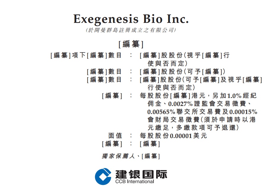 獨家保薦人、[編纂] 「編纂」項下 | 編纂 |數目 : 「編纂]股股份(視乎 | 編纂]行 使與否而定) [編纂]數目 .. 「編纂]股股份(可予[編纂]) : 「編纂]數目 「編纂]股股份(可予[編纂]及視乎|編纂] 行使與否而定) 【繼臺】 : 每 股 股 份 [ 編 纂 ] 港 元,另 加 1.0% 經 紀 佣金、0.0027% 證 監 會 交 易 徵 費、 0.00565% 聯 交 所 交 易 費 及 0.00015% 會財局交易徵費(須於申請時以港 元繳足,多繳款項可予退還) : 每 股 股 份 0.00001 美 元 面 值 .. [繼營] | 繼臺] 1月14日,Exegenesis Bio Inc.向港交所主板递交上市申请,建银国际为其独家保荐人。据招股书,Exegenesis Bio Inc.凭借其自 主研发的AAVarta及SODA技术平台,开发出多元化且可扩展的产品管线,包括核心候选产品EXG001-307(SMA1型)及两款关键 候选产品,即EXG102-031和EXG202。 Exegenesis Bio Inc. (於開曼群島註冊成立之有限公司) [編纂] ...