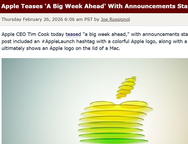 Core Viewpoint - Apple CEO Tim Cook announced a significant product launch event scheduled for March 2, indicating that it will be a pivotal moment for the company [1] Group 1: Upcoming Product Launch - Apple plans to unveil multiple new products over three days from March 2 to March 4, with expectations of up to five new releases across various categories [4] - The anticipated products include a low-cost MacBook, iPhone 17e, iPad Air with M4 chip, iPad 12 with A18 chip and Apple Smart features, MacBook Air with M5 chip, and MacBook Pro with M5 Pro/Max chips [4] - Selected journalists and content creators have been invited to an "Apple Experience Day" on March 4 at 9 AM ET, where they will have the opportunity to experience the newly launched products firsthand [4] Group 2: Event Details - The new products will be announced through press releases on Apple's newsroom website, and there are currently no plans for a live stream of the event [4] - There is ongoing speculation regarding updates to Apple TV and HomePod mini, but it remains unconfirmed whether these will be included in the upcoming launch [4]