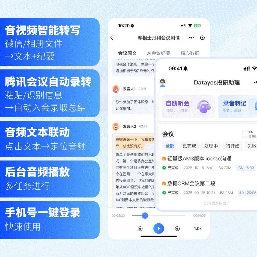 小程序核心价值:移动办公自由 Get ! 投研场景中,您是否常面临这些问题:线下会议要点记录不全?移动途中需复盘会议却无设备支持?移动场景下投研效率受限? 别担心!为突破时间与场景限制,提升金融专业人士投研效率,「萝卜投研 Pro AI 助手」微信小程序正式上线!从此,高效投研可随时随地实现。 l 移动端智能会议辅助功能,可随时随地记录、复盘、整理关键信息。通勤途中、出差现场、线下会议等多场景下,投研办公均不受限。 l 后续规划:小程序 将逐步扩展文档翻译、 AI 搜索、知识库等功能 ,敬请期待 …… 即刻体验指南 体验方式:微信搜索「萝卜投研 Pro AI 助手」小程序,使用手机号一键登录(需与 Datayes!Pro SaaS 端绑定手机号一致),即可解锁移动投研新体 验。 其他功能更新速览,实用度拉满! l AI 搜索: 股票一页纸全面优化,加载速度与整体性能显著提升,信息查询更流畅; l 研报模块: 新增「推荐」选项卡(按热度排序,快速获取高关注研报),详情页支持中英 PDF 合并下载,便于本地对照阅读,提升跨语言研读效 率; l 行业模块: 财务分析新增「有息负债率」指标,丰富数据维度、提升分析精准 ...