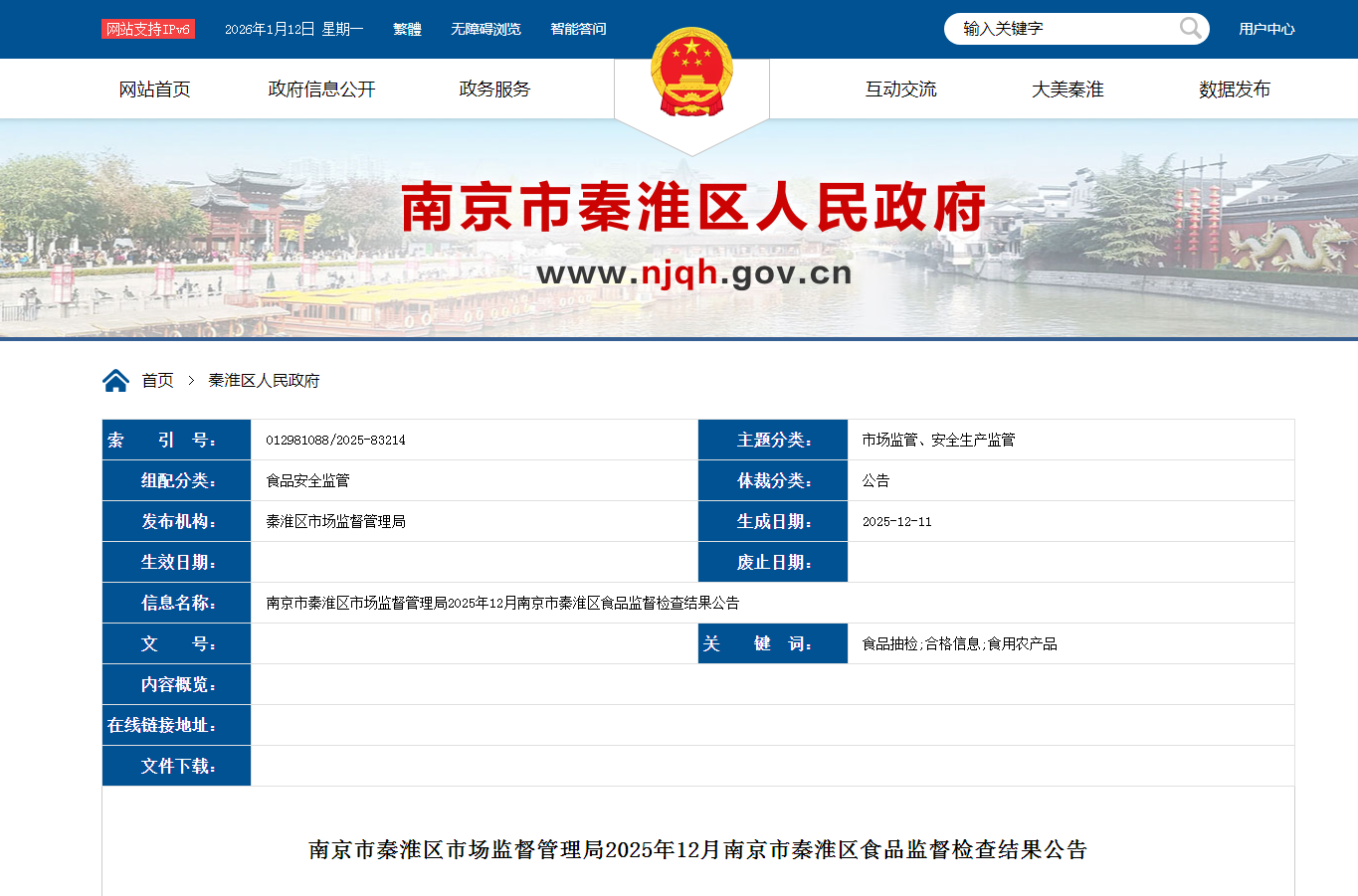 | 索 레 | 012981088/2025-83214 | | 主题分类: | 市场监管、安全生产监管 | | --- | --- | --- | --- | --- | | 组配分类: | 食品安全监管 | | 体裁分类: | 公告 | | 发布机构: | 秦淮区市场监督管理局 | | 生成日期: | 2025-12-11 | | 生效日期: | | | 废止日期: | | | 信息名称: | | 南京市秦淮区市场监督管理局2025年12月南京市秦淮区食品监督检查结果公告 | | | | 文 号: | | | 关 键 词: | 食品抽检;合格信息;食用农产品 | | 内容概览: | | | | | | 在线链接地址: | | | | | | 文件下载: | | | | | 南京市秦淮区市场监督管理局2025年12月南京市秦淮区食品监督检查结果公告 南京市秦淮区市场监督管理局于2025年12月对辖区内的糕点、调味品、方便食品、糖果制品、乳制品、豆制品、水果制品、饼干、食用农产品、食糖、餐饮 食品、饮料、炒货食品及坚果制品、薯类和膨化食品、蔬菜制品、淀粉及淀粉制品、粮食加工品、食用油、油脂及其制品、速冻食品等 ...