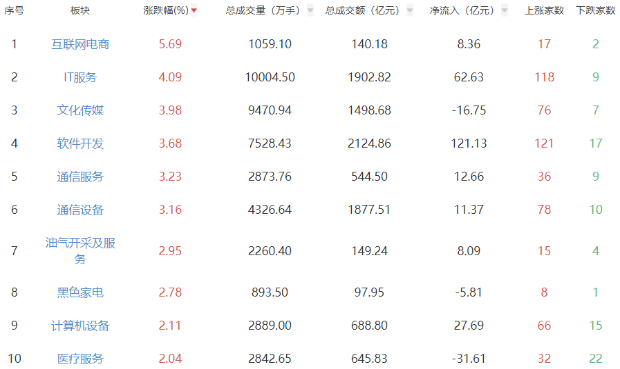 (责任编辑:马欣) | 序号 | 板块 | 涨跌幅(%)▼ | | 总成交量(万手) = 总成交额(亿元) ▼ | 净流入 (亿元) ▼ | 上涨家数 | 下跌家数 | | --- | --- | --- | --- | --- | --- | --- | --- | | 1 | 文化传媒 | 7.96 | 7244.83 | 947.88 | 4.59 | 82 | 2 | | 2 | IT服务 | 7.92 | 8224.94 | 1538.89 | 122.25 | 125 | 3 | | 3 | 软件开发 | 7.76 | 6402.23 | 1713.92 | 214.60 | 133 | র্ব | | র্ব | 军工电子 | 7.34 | 4143.92 | 1315.90 | 58.34 | 28 | ব | | 5 | 影视院线 | 6.48 | 1975.38 | 192.99 | 20.39 | 19 | 1 | | 6 | 游戏 | 5.98 | 2981.43 | 508.09 | 43.01 | 21 | 3 | | 7 | 互联网电商 | 5.59 | 713.45 | 106 ...