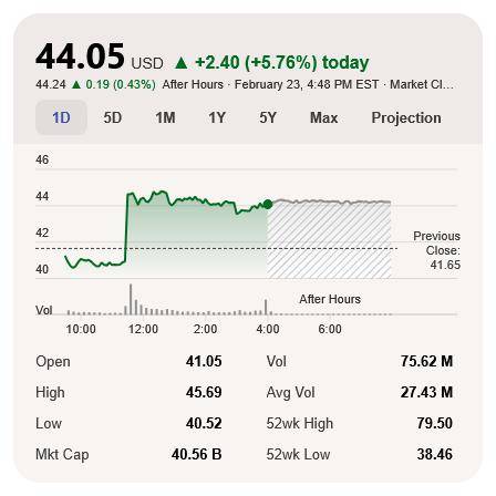 IT之家 2 月 24 日消息,支付平台 PayPal 贝宝过去一年股价出现了 41.23% 的下跌,本月初公布不及市场预期的财报后甚至一度跌破 40 美元关口,最低点 38.46 美元甚至不到 52 周最高点 79.50 美元的一半。 多位分析师认为,尽管 PayPal 的市值快速蒸发,但其体量仍相当庞大,其资产组合具有战重要性,在 AI 时代仍有不少挖掘价值的余地。 | | | | 44.05 USD ▲ +2.40 (+5.76%) today 44.24 0.19 (0.43%) After Hours · February 23, 4:48 PM EST · Market Cl ... | | | | | --- | --- | --- | --- | --- | --- | --- | | 1D | 5D | 1M | 1Y | 5Y | Max | Projection | | 46 | | | | | | | | 44 | | | | | | | | 42 | | | | | | Previous Close: | | 40 | | | | | | 41.65 | | Vol | | | | ...