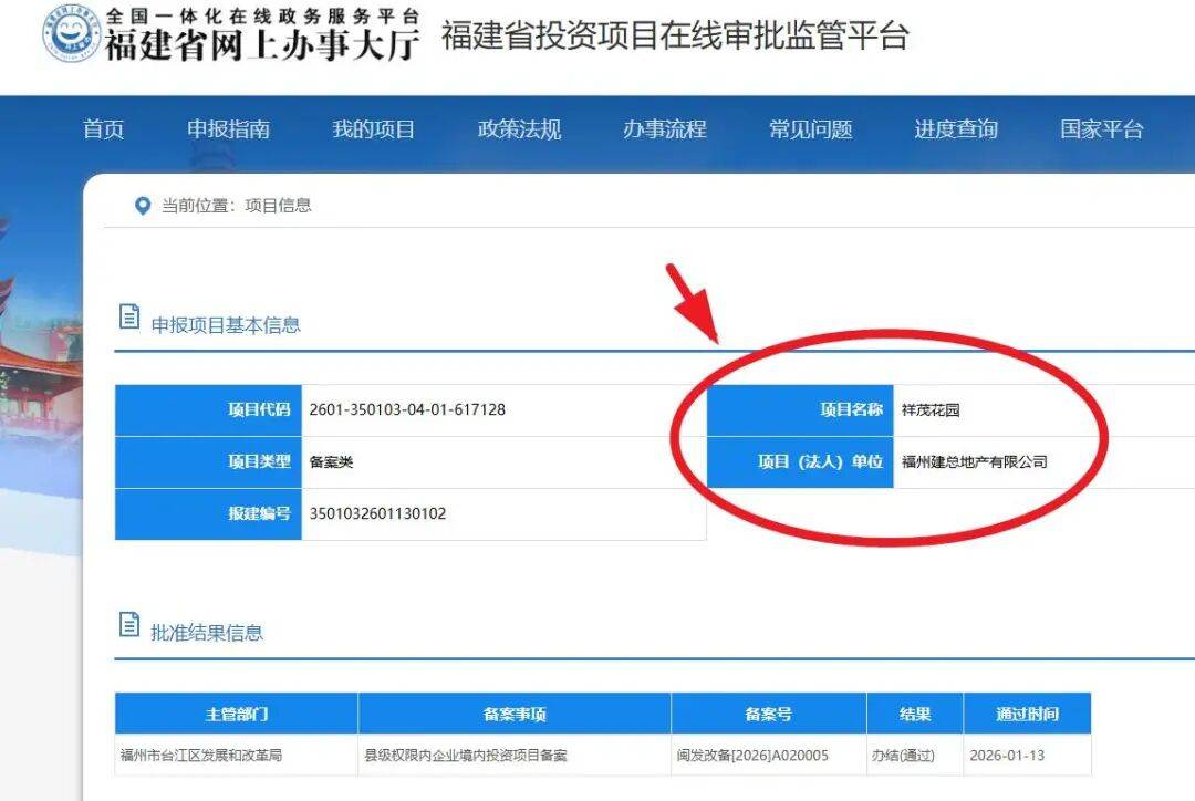 海西房产网(微信公众号:fjhxfcw)消息:福建省投资项目在线审批监管平台发布信息显示, "祥茂花园"已于2026年1月13日取得县级权限内企业境内投 资项目备案,批准结果信息为办结(通过)。 | 首页 申报指南 | 我的项目 | > > 福建省网上办事大厅 福建省投资项目在线审批监管平台 政策法规 | 办事流程 常见问题 | | 进度查询 | 国家平台 | | --- | --- | --- | --- | --- | --- | --- | | Q 当前位置:项目信息 | | | | | | | | 目 申报项目基本信息 | | | | | | | | 项目代码 | 2601-350103-04-01-617128 | | | 硕目名称 | 祥茂花园 | | | 顾目类型 | 备案类 | | 项目 (法人) 单位 | | 福州建总地产有限公司 | | | 报建编号 | 3501032601130102 | | | | | | | 目 批准结果信息 | | | | | | | | 主管部门 | | 备案事项 | 备案号 | | 結果 通过时间 | | | 福州市台江区发展和改革局 | 县级权限内企业境内投 ...