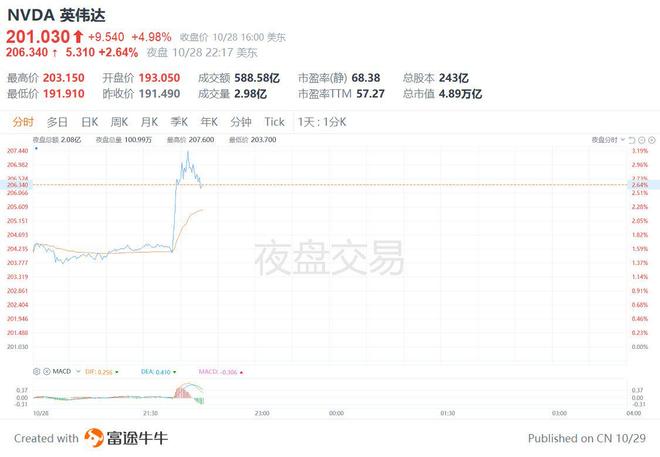 格隆汇10月29日|英伟达(NVDA.US)在目前的美股夜盘交易中快速拉升,一度涨超3%报207.4美元,再 创历史新高价,开盘市值有望突破5万亿美金。据媒体消息,特朗普表示可能会与中国讨论英伟达的 Blackwell芯片。 ...